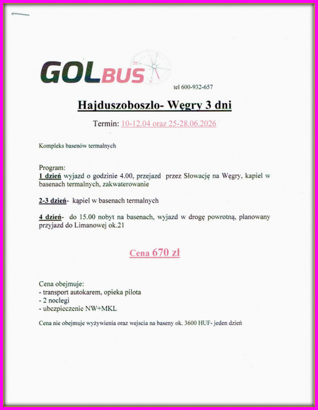Hajduszoboszlo 10-12.04 oraz 25-28.06.2026